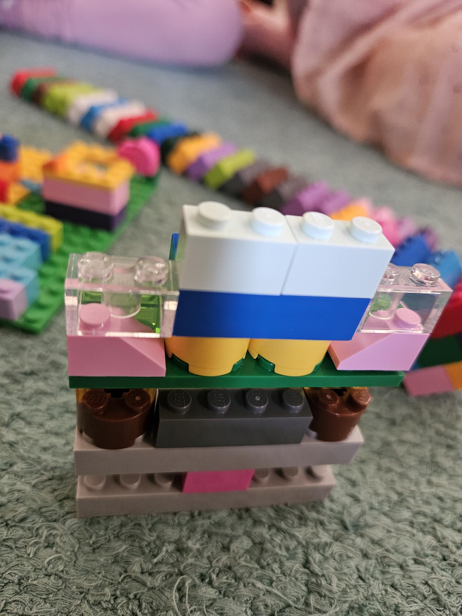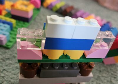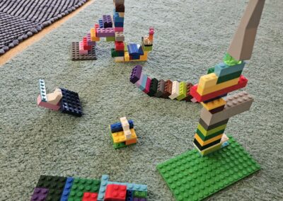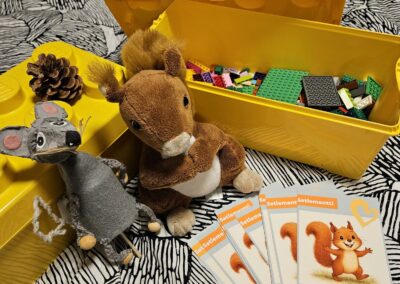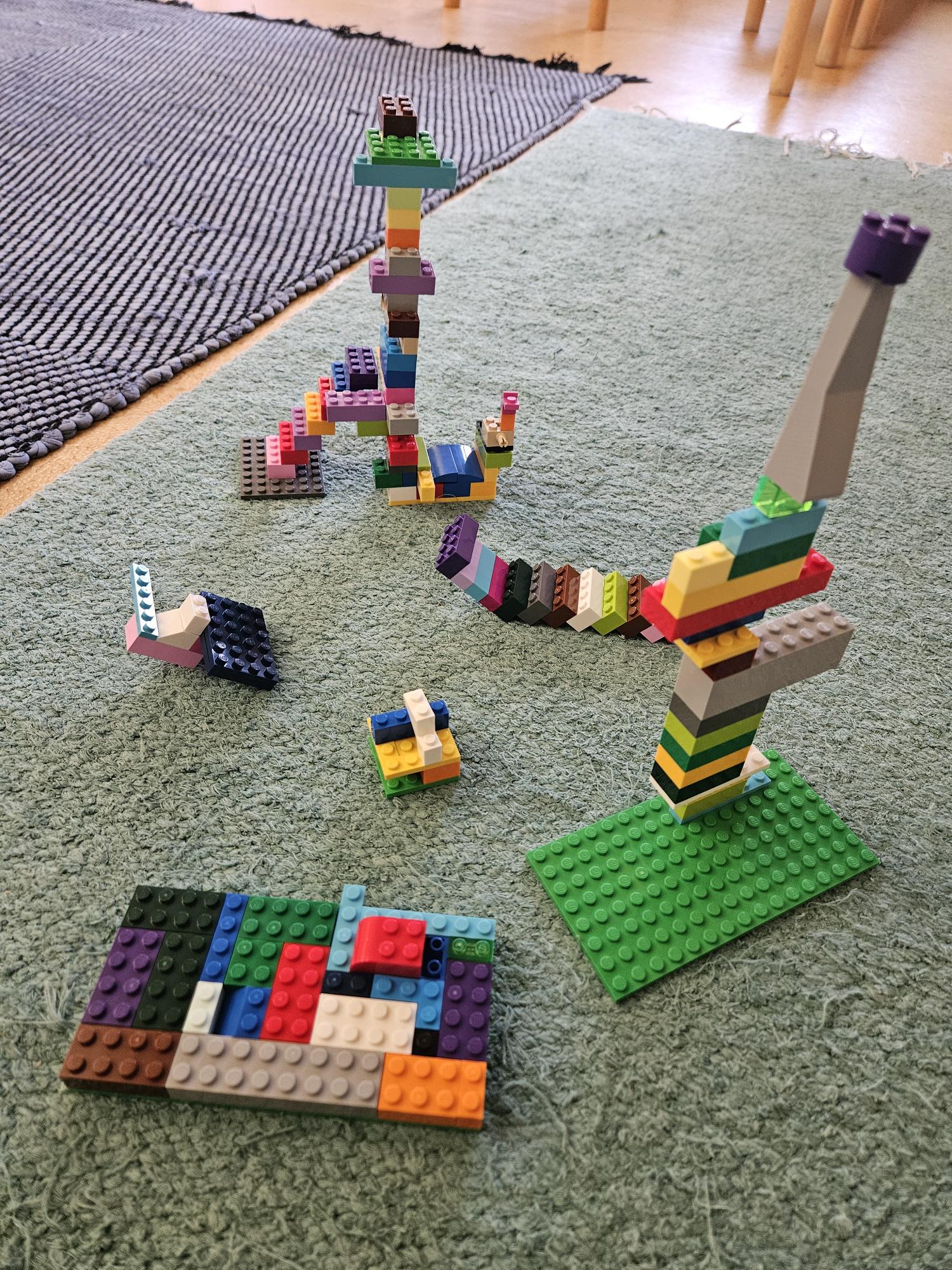 Tarinan innoittamana siirryimme rakentamaan apuvälineitä legopalikoista. Jokainen sai päättää, rakentaako yksin vai yhdessä. Jotkut lapset lähtivät heti tekemään yhteisiä rakennelmia: ”Yhdistetäänkö meidän portaat?” – ”Hyvä ajatus!”